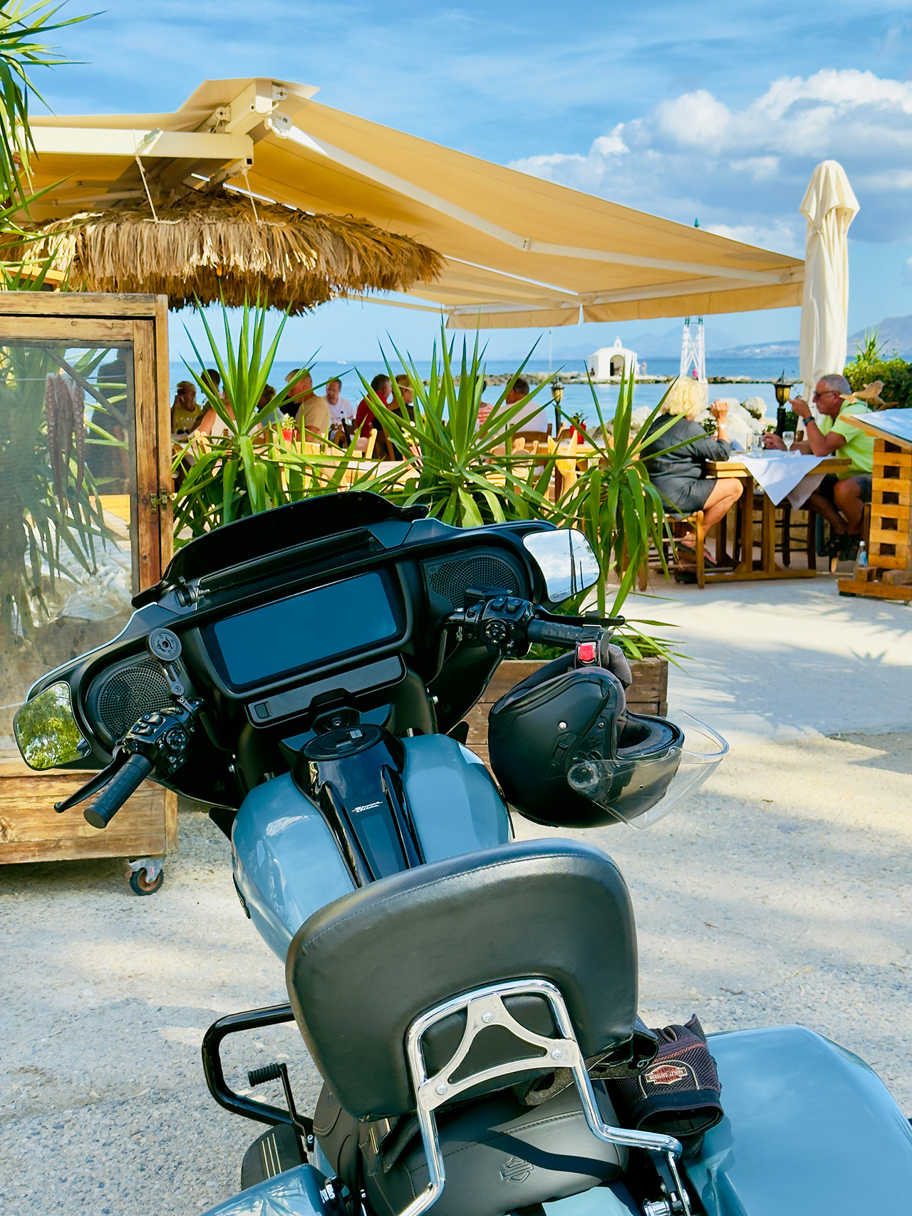 Am nächsten Tag setzen wir uns also auf unseren Thron namens Harley, lassen es blitzen und donnern und starten unsere nächste göttliche Tour sinnigerweise zur Idäischen Grotte, der Legende nach die Geburtshöhle von Zeus. Wir schrauben uns von der Nordküste hoch ins Gebirge, aus der Ferne grüßt der Psiloritis, mit 2.456 m Höhe der höchste Berg Kretas. Ganz so hoch fahren wir nicht, aber bis zur Idäischen Grotte schaffen wir immerhin 1.300 Höhenmeter. Und das auf sensationellen Straßen, kurvig, guter Asphalt, beeindruckende Landschaft, die Fahrzeuge, die uns auf ca. 50 km begegnen, können wir an zwei Händen abzählen. Kurzum: pures Bikervergnügen. Im Bergdorf Anogia, dem Inbegriff der kretischen Heimatliebe und des Widerstandwillens der Kreter, machen wir Mittagsrast. Und wieder staunen wir über die umwerfende Gastfreundschaft, hätten die Bewohner von Anogia doch allen Grund, uns Deutsche misstrauisch zu beäugen. Schließlich hat die deutsche Wehrmacht 1943 das gesamte Dorf platt gemacht und ein Massaker an der Bevölkerung verübt. Doch die kretische Gastfreundschaft lässt auch bei uns keinen Gedanken an diese Greueltaten aufkommen. Auf dem Weg zurück gleiten wir entspannt zur Nordküste runter, finden noch Zeit für einen Kaffee im kleinen Fischerort Bali und sind beim „Feierabend-Bierchen“ im Hotel einer Meinung: Es könnte durchaus was dran sein, an dieser Theorie, dass Zeus ein Biker war. Zumindest muss er bei der Straßenplanung an uns kurvengeile Harley-Halbgötter gedacht haben.