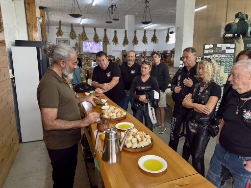 Am letzten Fahrtag steht noch einmal Geschichtliches im Tourbook, aber hübsch verpackt in eine erstklassige Abschlussrunde zur Theriso-Schlucht. Die enge Schlucht mit steil aufragenden Wänden ist mal echt malerisch, leichtes Kurvengeschlängel begleitet von Ziegenherden oder herunter gestürzten Gesteinsbrocken. Im Dorf Theriso hatte einst Elefterios Venizelos sein Hauptquartier. Er war der maßgebliche Politiker, der den Anschluss Kretas an das Mutterland Griechenland erreichte. Wir nehmen uns mitten im kleinen Dorf Zeit, um einen Kaffee zu schlürfen und über die Geschichte Kretas nachzudenken. Auf dem Rückweg müssen wir ausweichen, denn ein Generalstreik der Bauern hat die Autobahn bei Chania lahm gelegt. Wir fahren auf der Parallelstraße an einem Streikposten vorbei und sind bass erstaunt über die Sitten und Gebräuche der Kreter. Hunderte Bauern in schwarzen T-Shirts bauen einfach mal eine kleine Zeltstadt mitten auf der Autobahn auf, grillen über einem Holzfeuer irgendein Tier mit mächtig viel Fleisch dran und ein paar Meter weiter zünden sie einen Reifenstapel an. Was die Bauern mit dieser Art des Streiks politisch erreicht haben, wissen wir nicht. Aber sie haben definitiv erreicht, dass die Fahrbahn der Autobahn grundlegend erneuert werden muss. Die letzte Etappe dieser Kreta-Reise führt uns zu Kanakis Ölmühle. Adonis, der Enkel des Firmengründers, nimmt sich Zeit für eine kleine Führung durch die Produktionsstätte und lässt uns natürlich auch sein leckeres Olivenöl verkosten.
